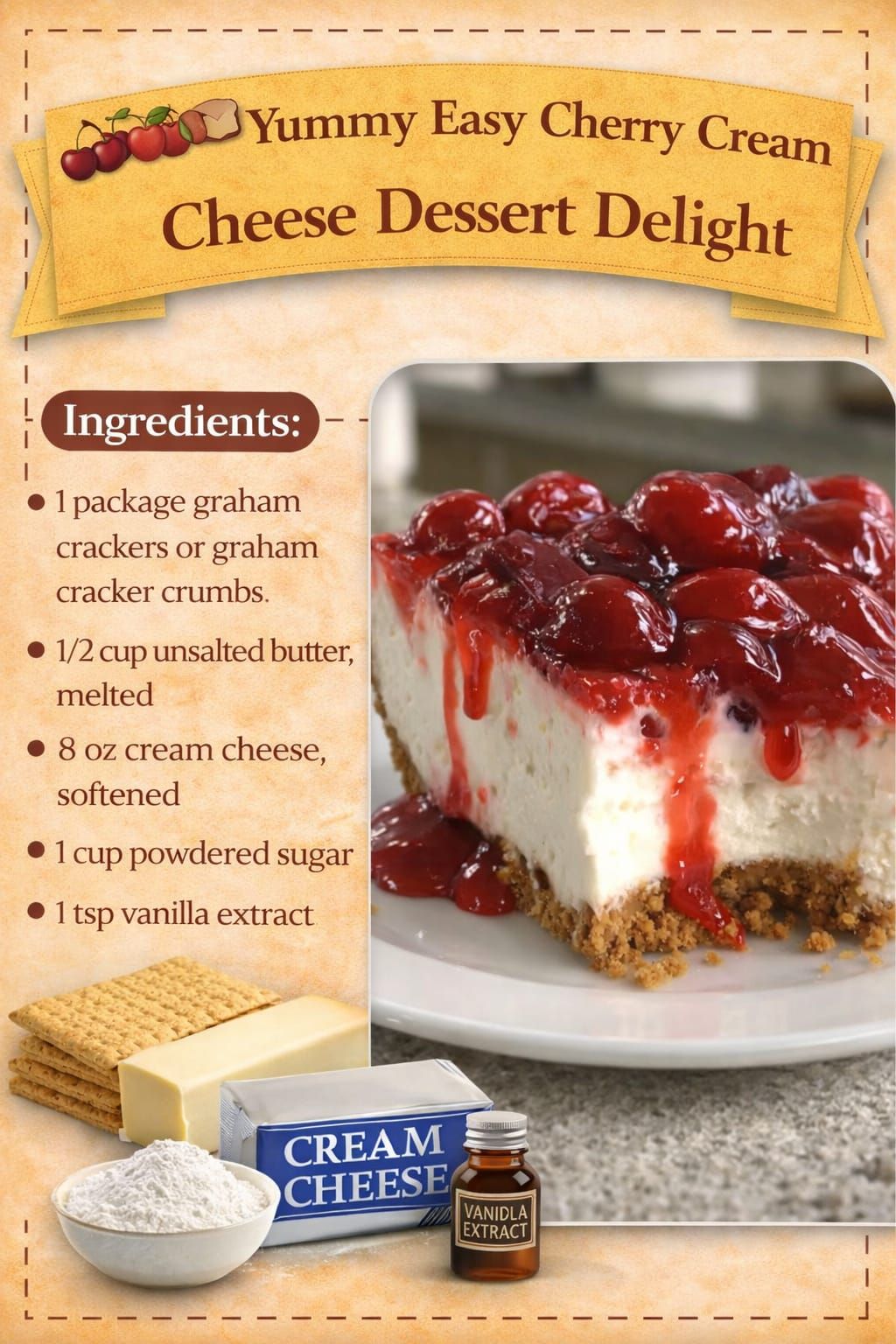 Before we jump into the recipe, let’s take a look at the key ingredients you’ll need to make this scrumptious Cherry Cream Cheese Dessert.