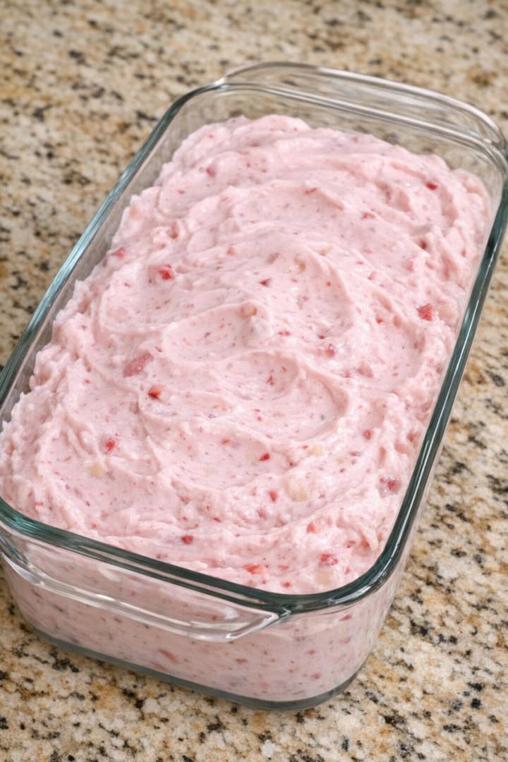 Aunt Linda keeps a tub of this Strawberry Banana Freezer Fluff in the freezer for last-minute sweet cravings—just scoop and watch it disappear. It’s one of those small-town, pass-it-around family recipes that’s perfect for busy evenings when you want something cold and creamy without a lot of fuss. Frozen strawberries and bananas get blended with vanilla yogurt and whipped topping into a pale pink, airy dessert that sets up beautifully in a simple glass loaf pan. It’s light, fruity, and sweet enough to feel special, but easy and practical enough for any weeknight treat.